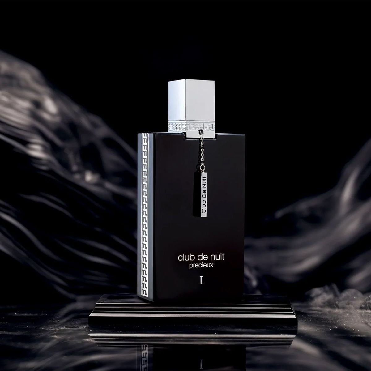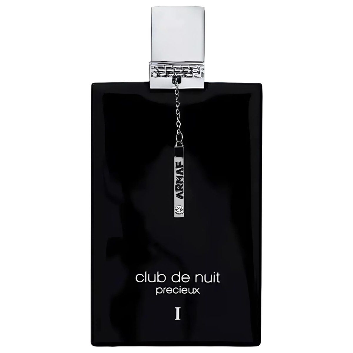 Club de Nuit Precieux 1 Armaf gây ấn tượng với thiết kế chai vuông vức, thân chai dẹp và mỏng, được phủ lớp màu đen piano bóng bẩy đầy sang trọng. Phần nắp kim loại bạc sáng bóng tạo sự tương phản nổi bật với thân chai tối màu. Điểm nhấn đặc biệt là chiếc thẻ nhôm in tên bộ sưu tập “Club de Nuit” treo từ cổ chai bằng một sợi dây xích bạc tinh tế.